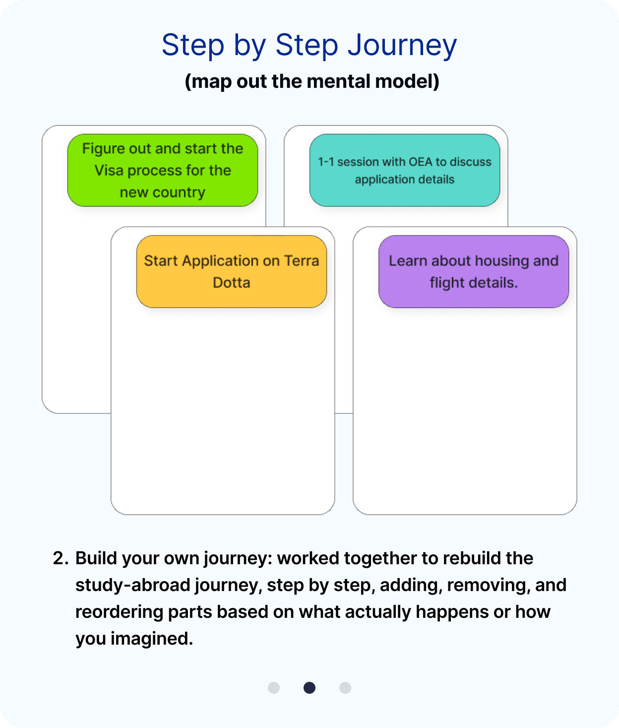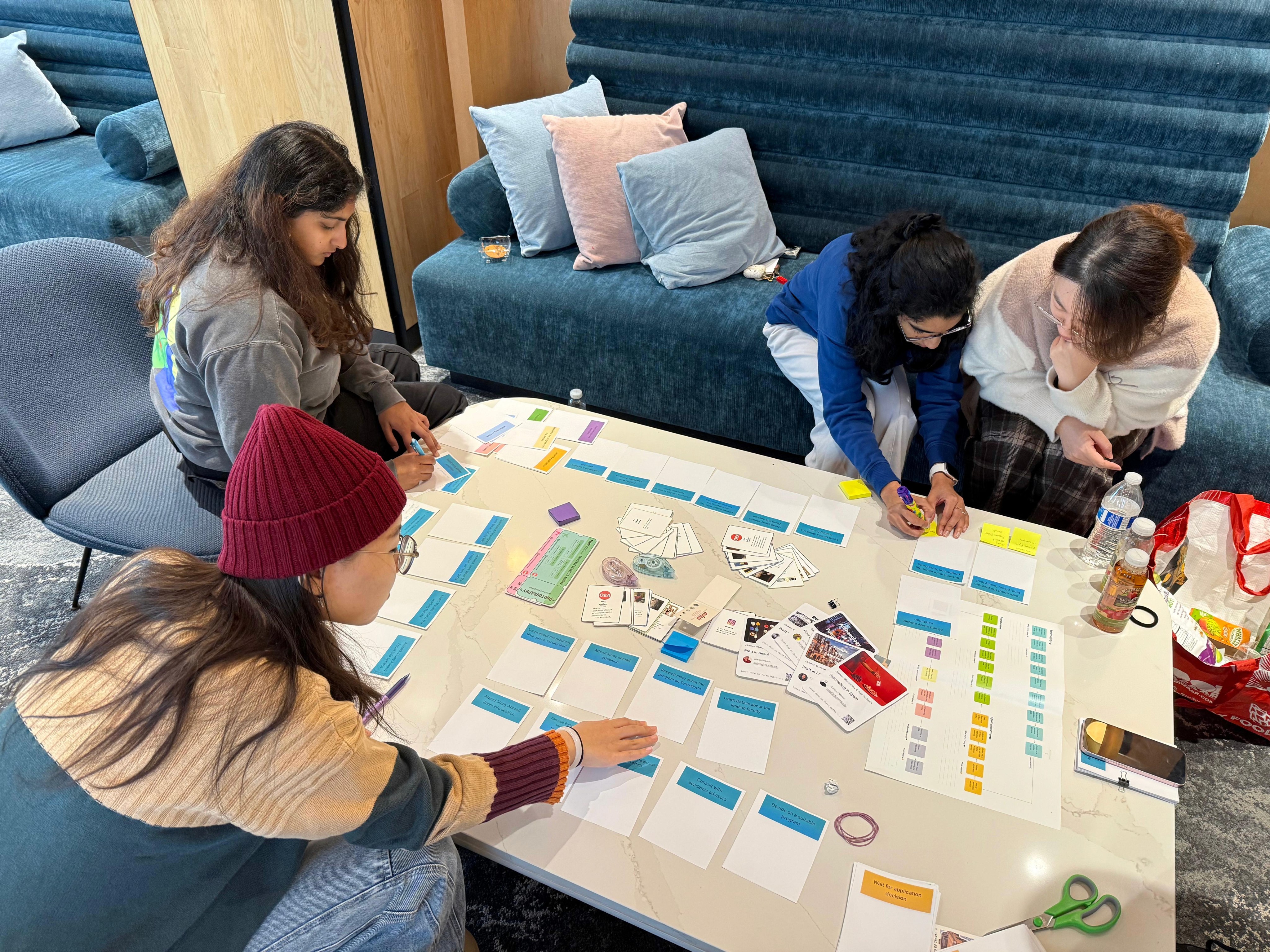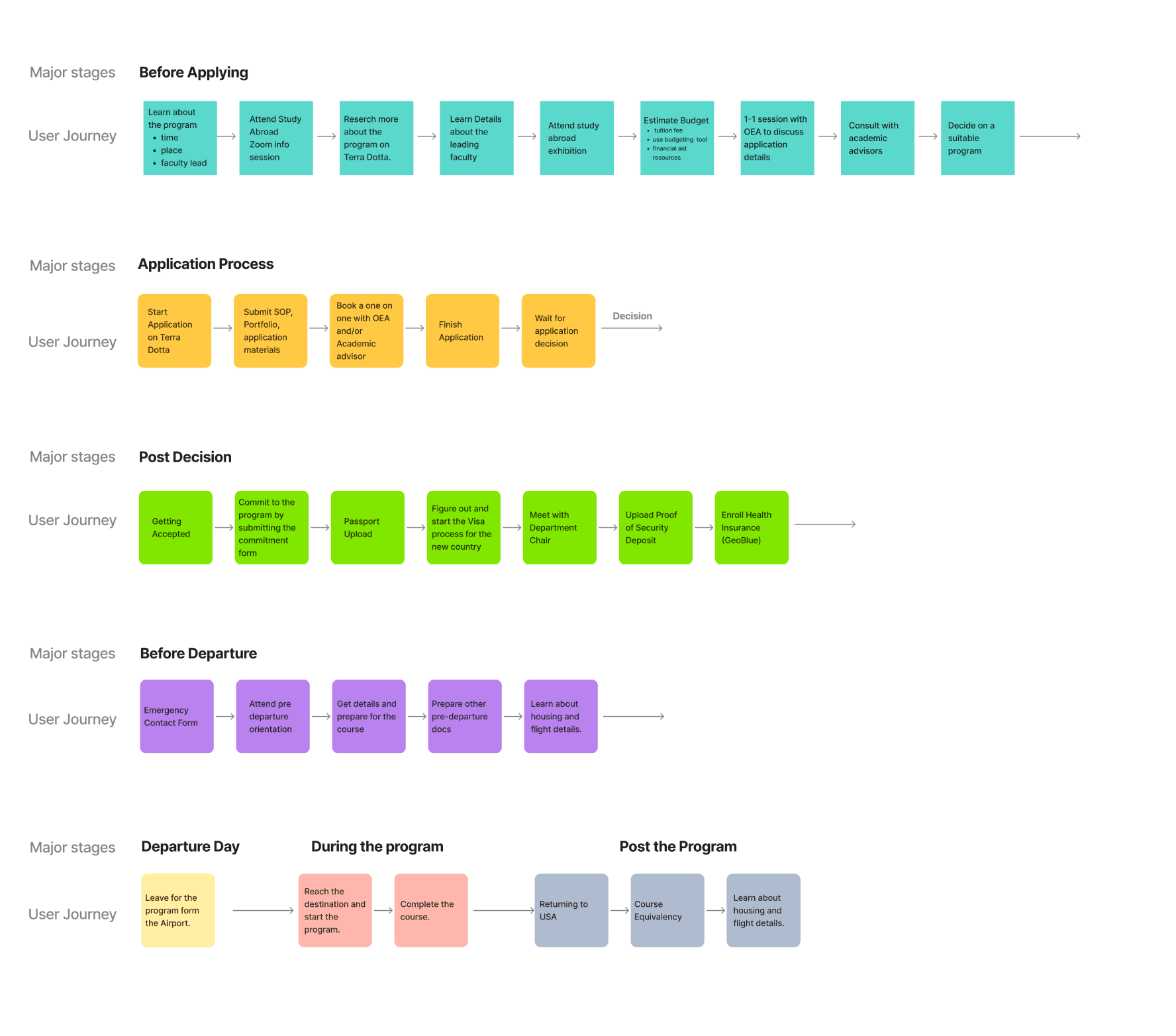 Before facilitating the co-design workshop, we developed a User Journey map based on information provided by the Office of Education Abroad (OEA). We broke the experience into four distinct phases, which later became the structural backbone of the