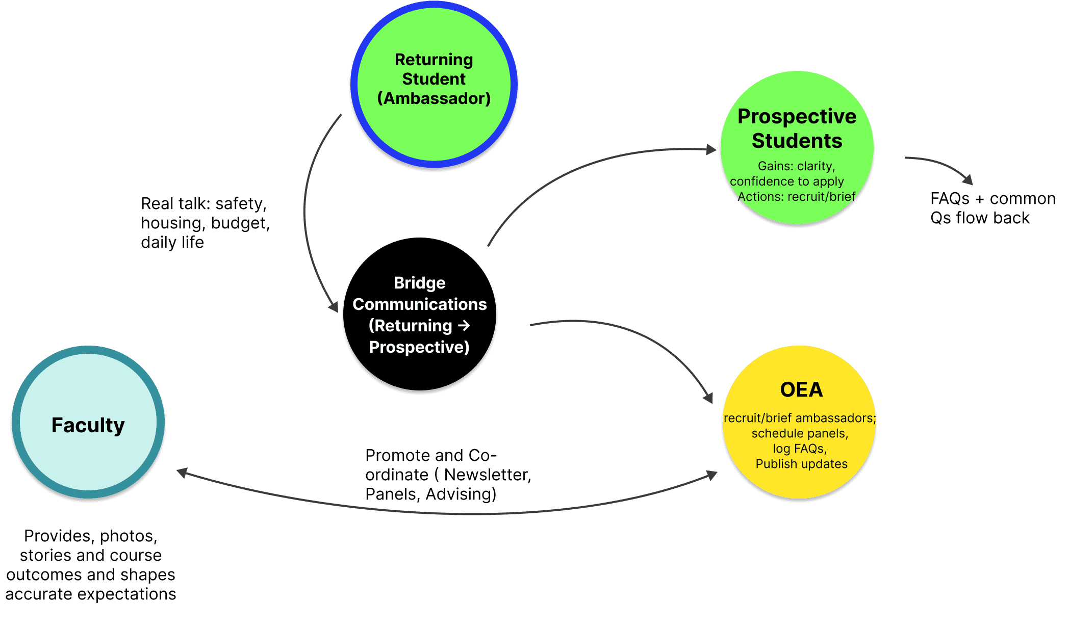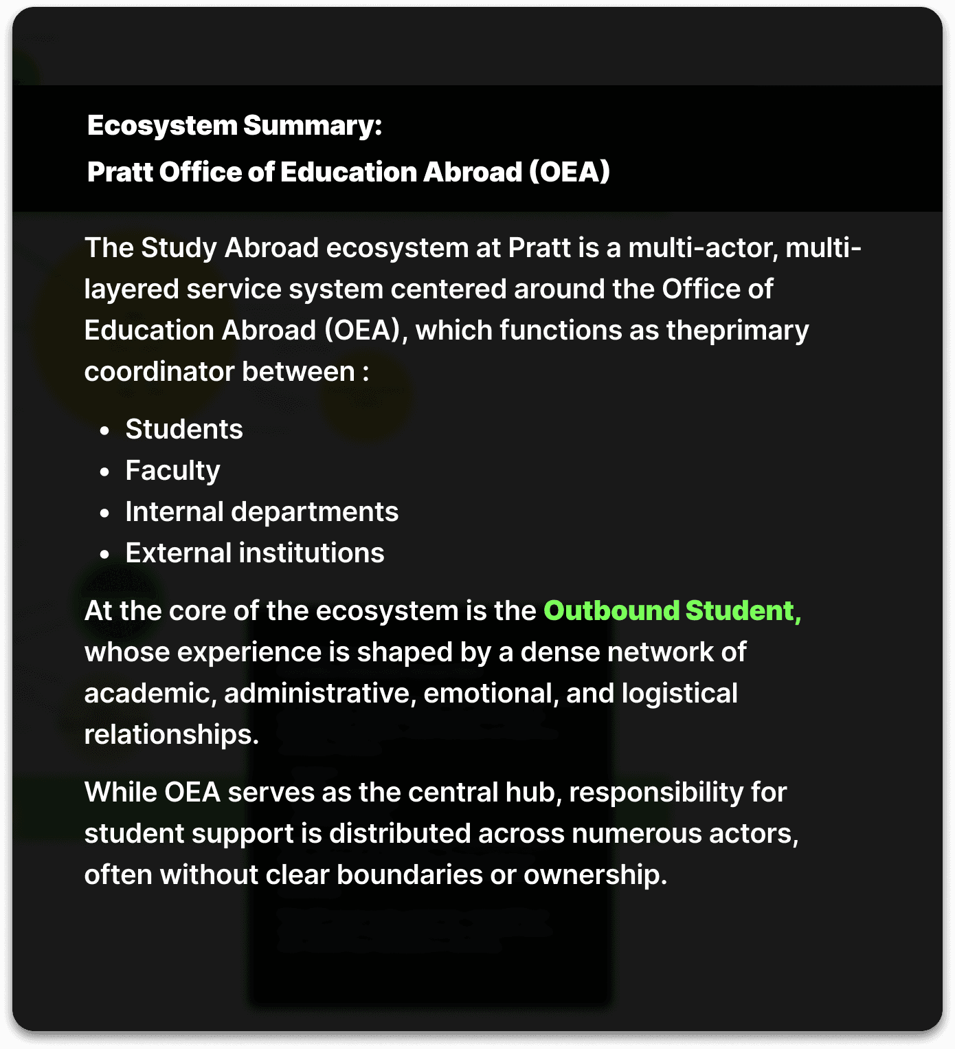 Leading this project reinforced for me that effective service design is as much about emotional reassurance as it is about structural clarity. By working closely with students, faculty, and OEA, I learned how small gaps in communication and visibility can significantly impact confidence and decision-making. This project challenged me to design beyond individual touch points and think systemically, balancing institutional constraints with human needs, to create interventions that are not only functional, but supportive, resilient, and meaningful within a complex educational ecosystem.