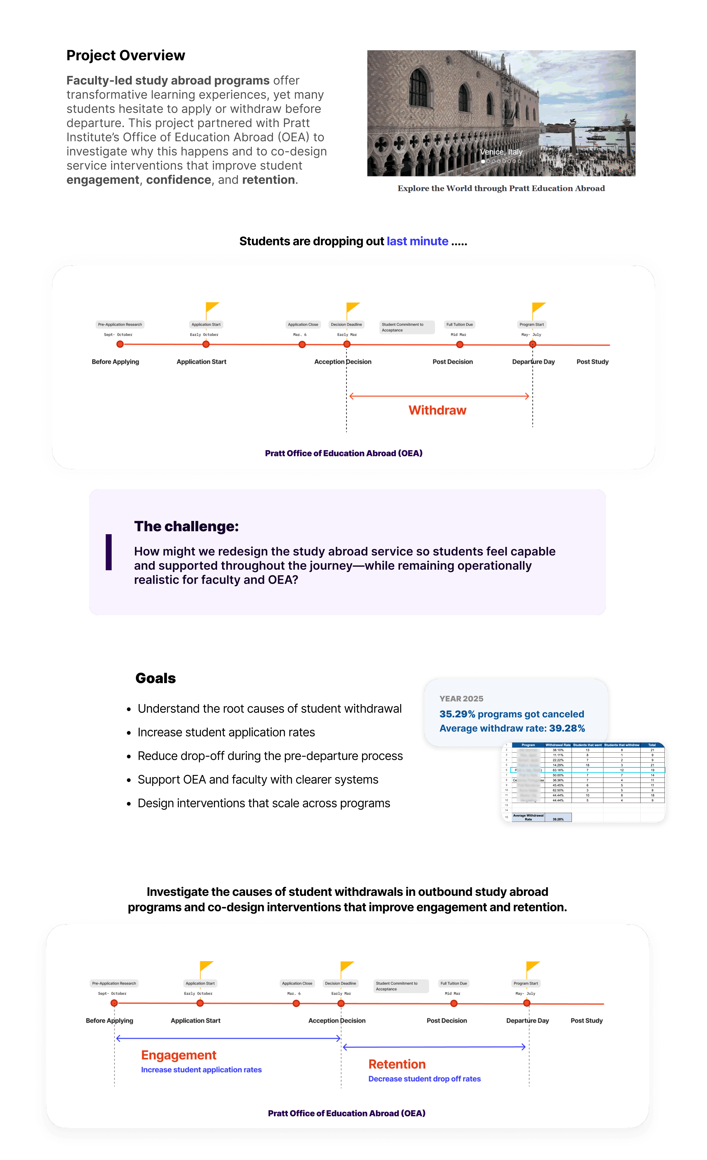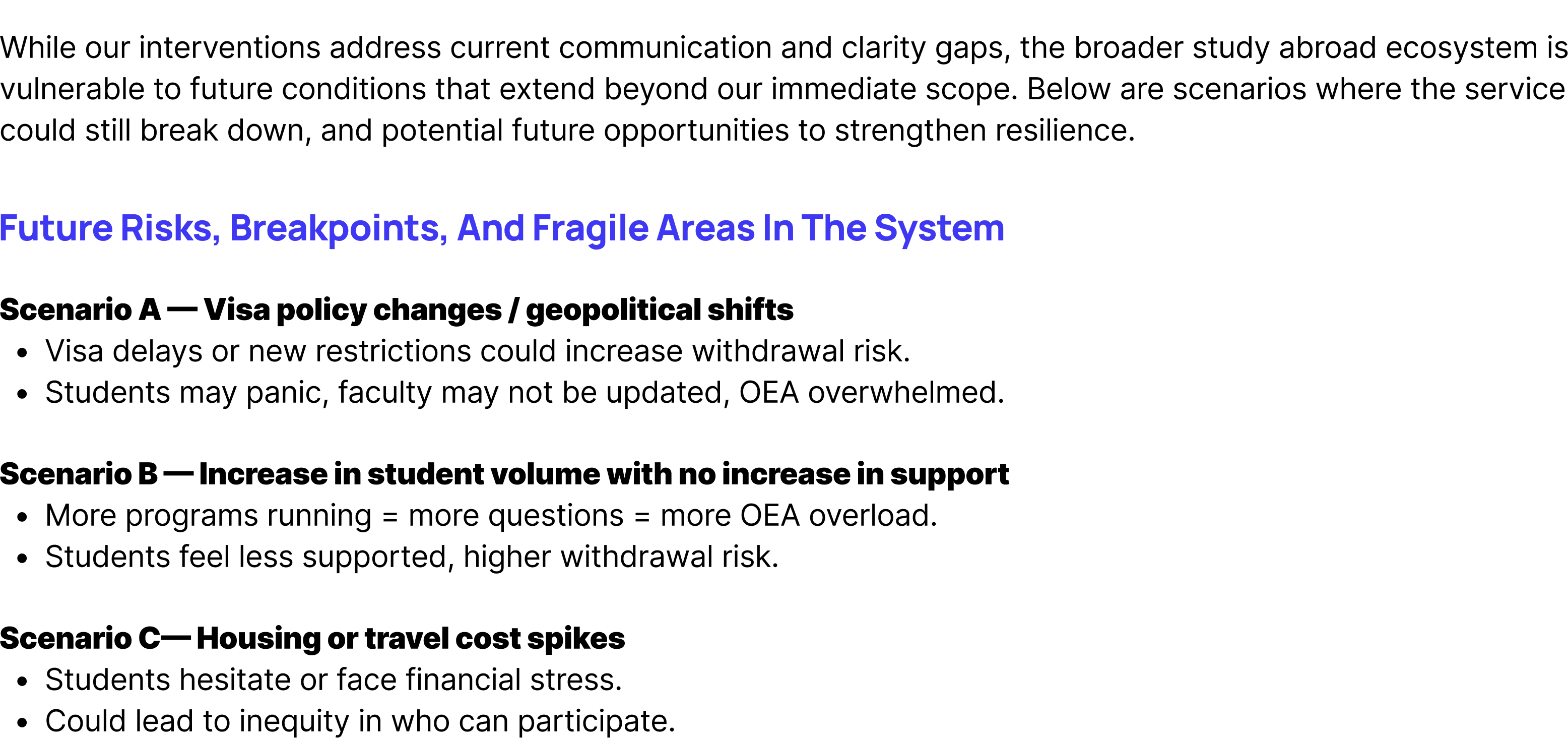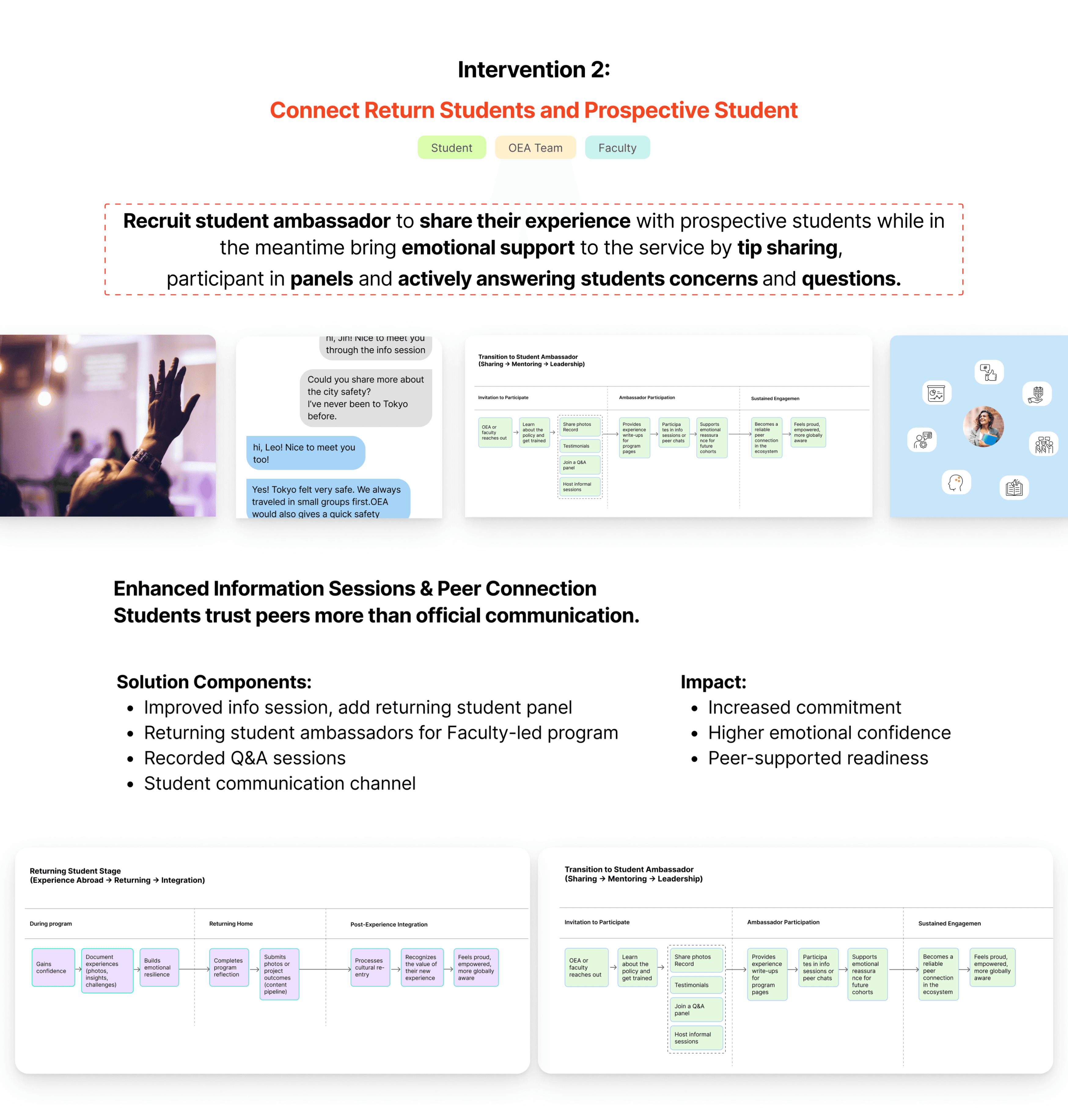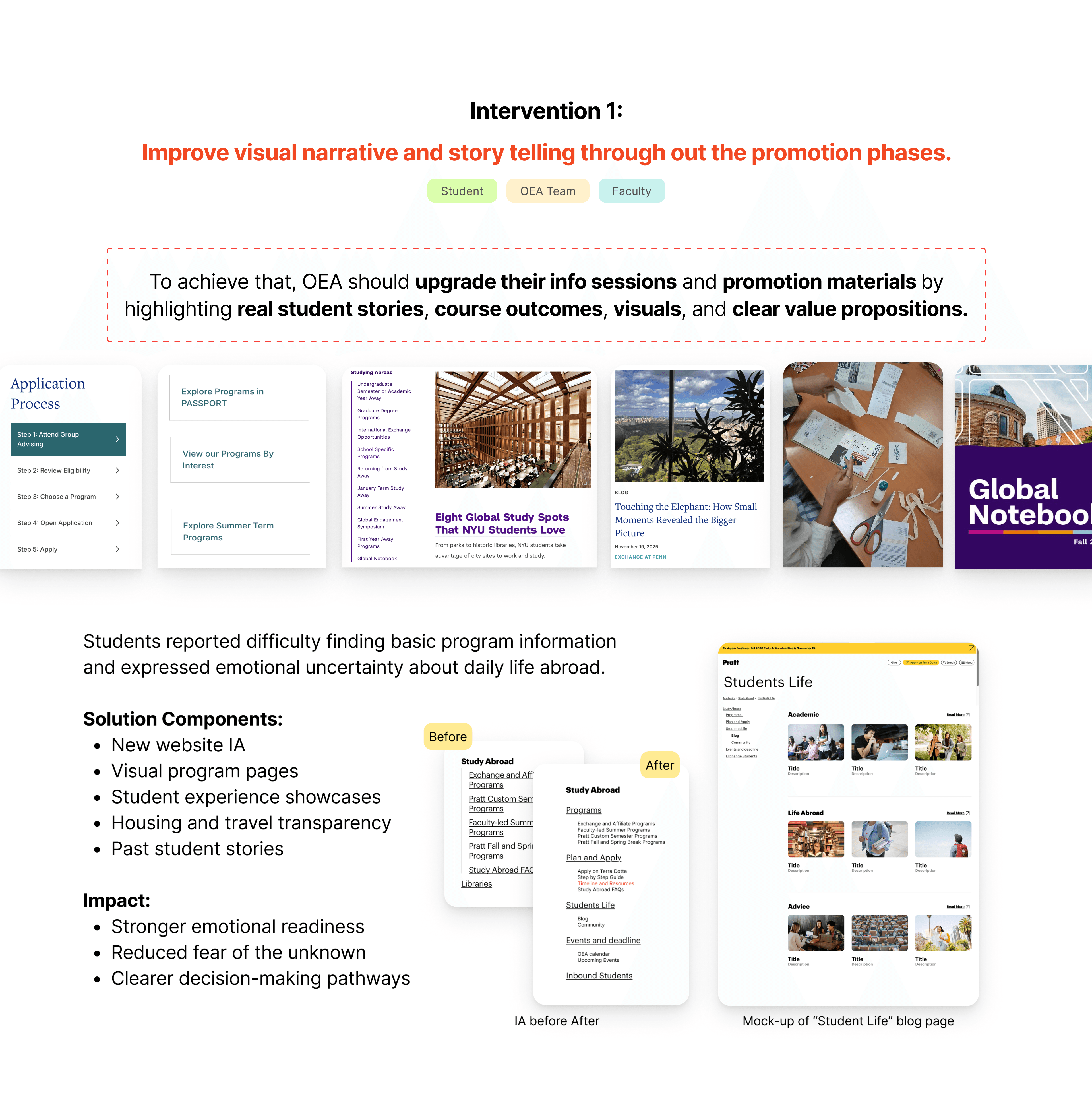 Based on our research insights, co-design workshops, and service blueprint analysis, we developed a set of targeted interventions to address the key breakdowns contributing to student hesitation and withdrawal. These interventions focus on strengthening communication, improving information clarity, and providing emotional support at critical moments in the study abroad journey. Together, they work as an integrated system to make the experience more transparent, achievable, and supportive for students, faculty, and OEA.
