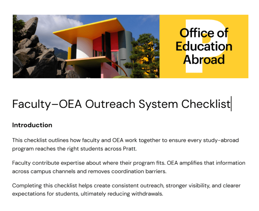 By standardizing the faculty admissions backend with a checklist and annual submission process, faculty can reliably submit core program information, allowing OEA to streamline and scale promotion across all Pratt channels.